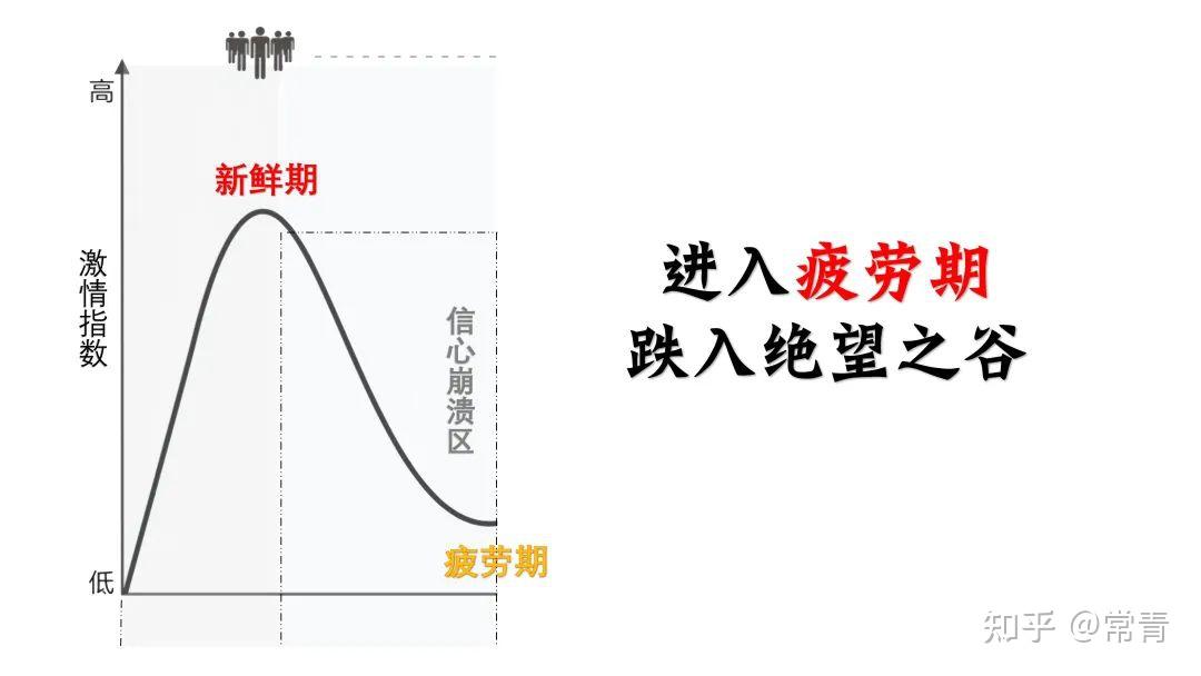 这里的疲劳期指的是:随着时间和现实的一些实际反馈,让我们慢慢发现,其实这些事并没有自己想象中那么容易,并开始感觉到任务有些负担,出现畏难或者无聊的情绪,从“上头”状态走出的一种状态。